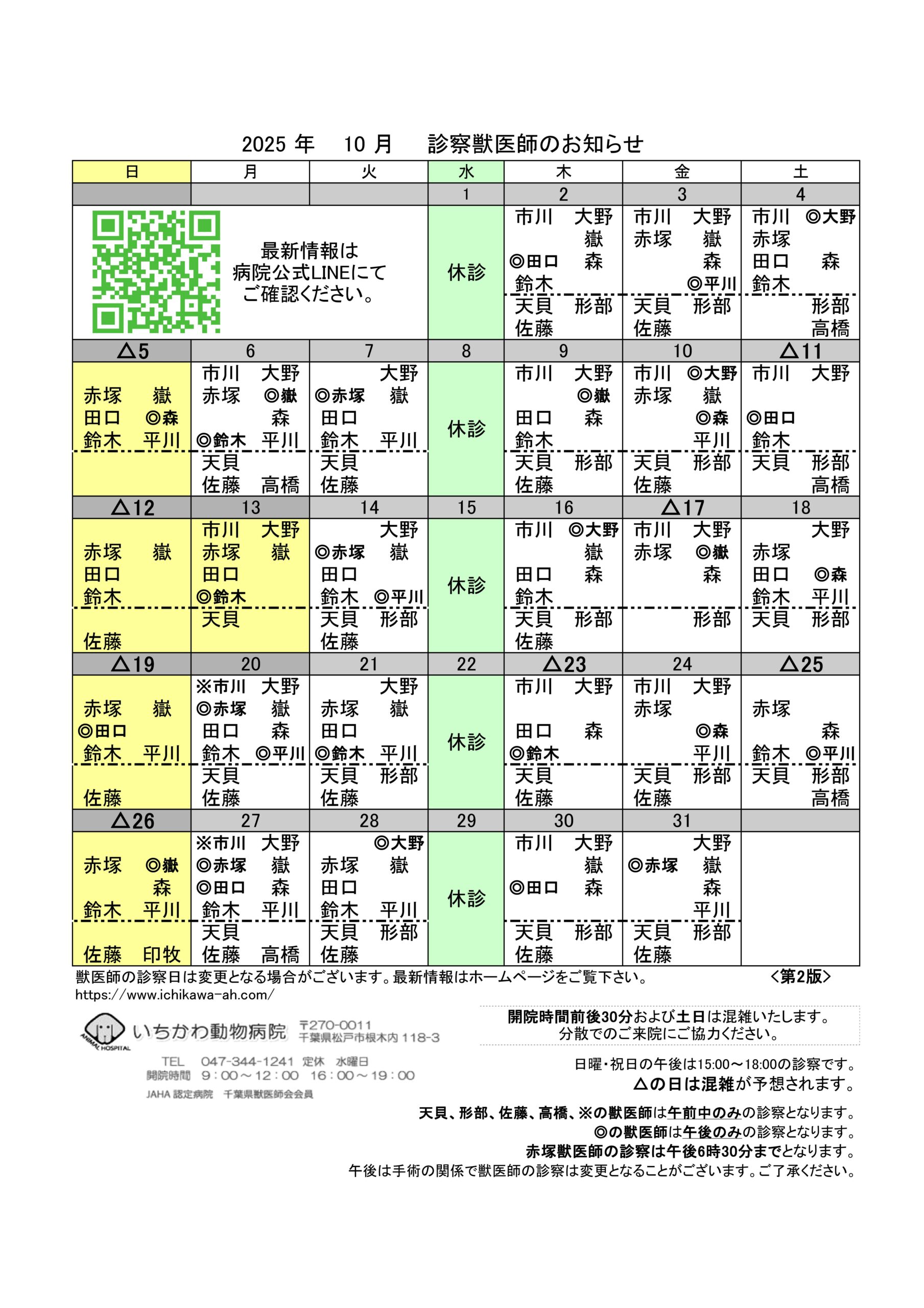 10月の獣医師勤務表(第2版)を更新