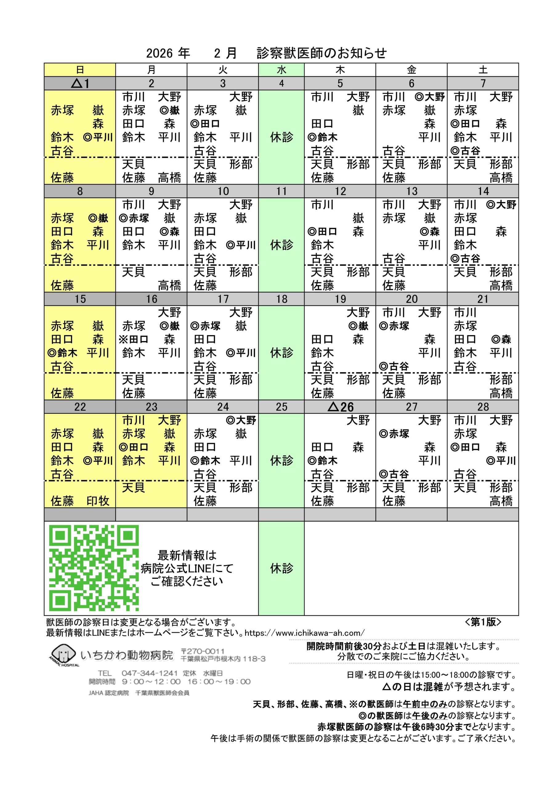 2月の獣医師勤務表(第1版)を更新