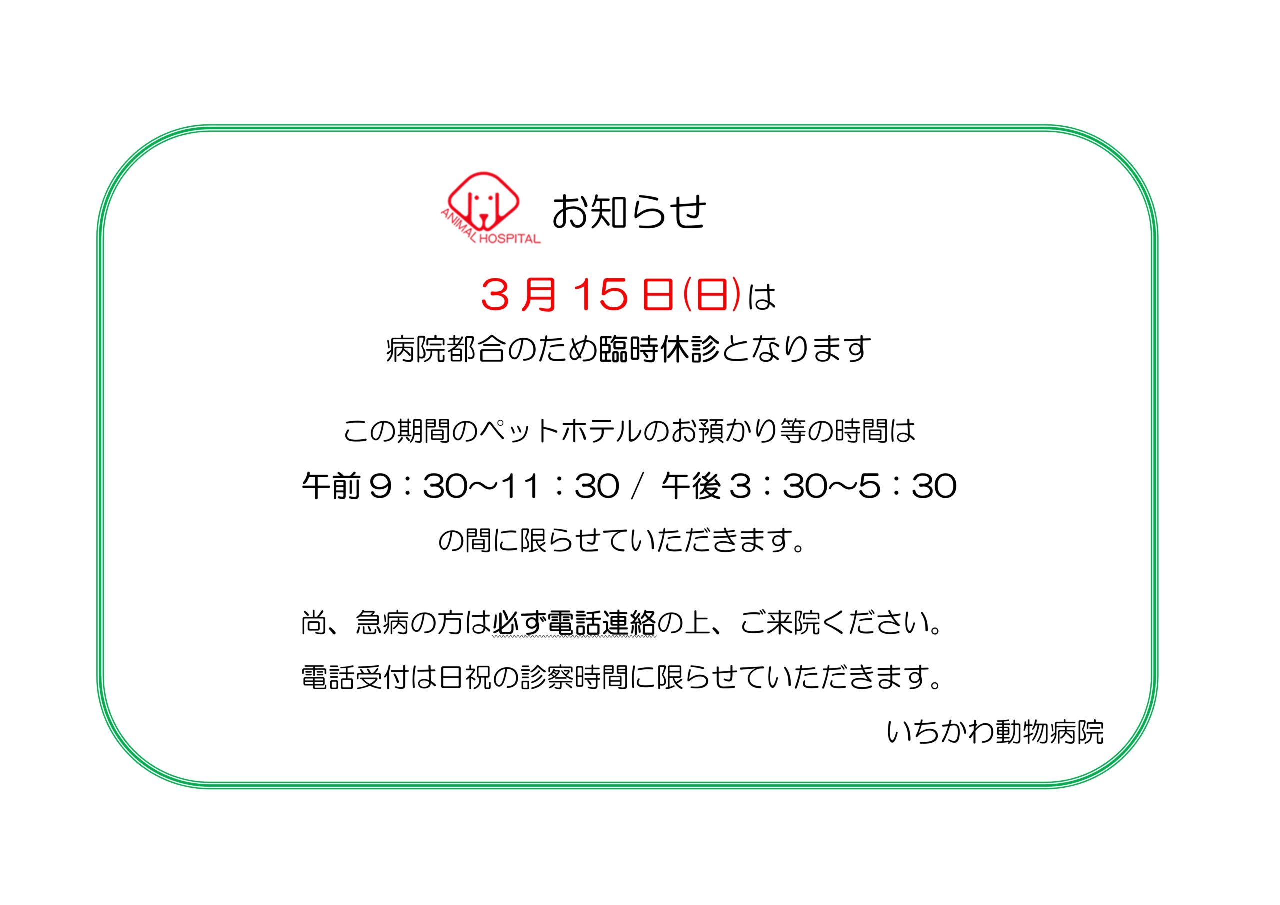 3/15(日)は病院都合により臨時休診となります。
